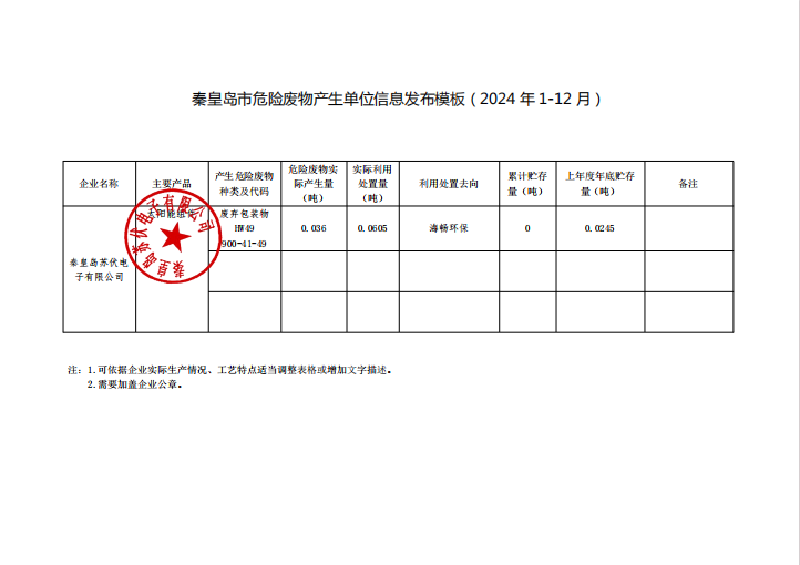 秦皇島市危險廢物產(chǎn)生單位信息發(fā)布(2024 年 1-12 月)